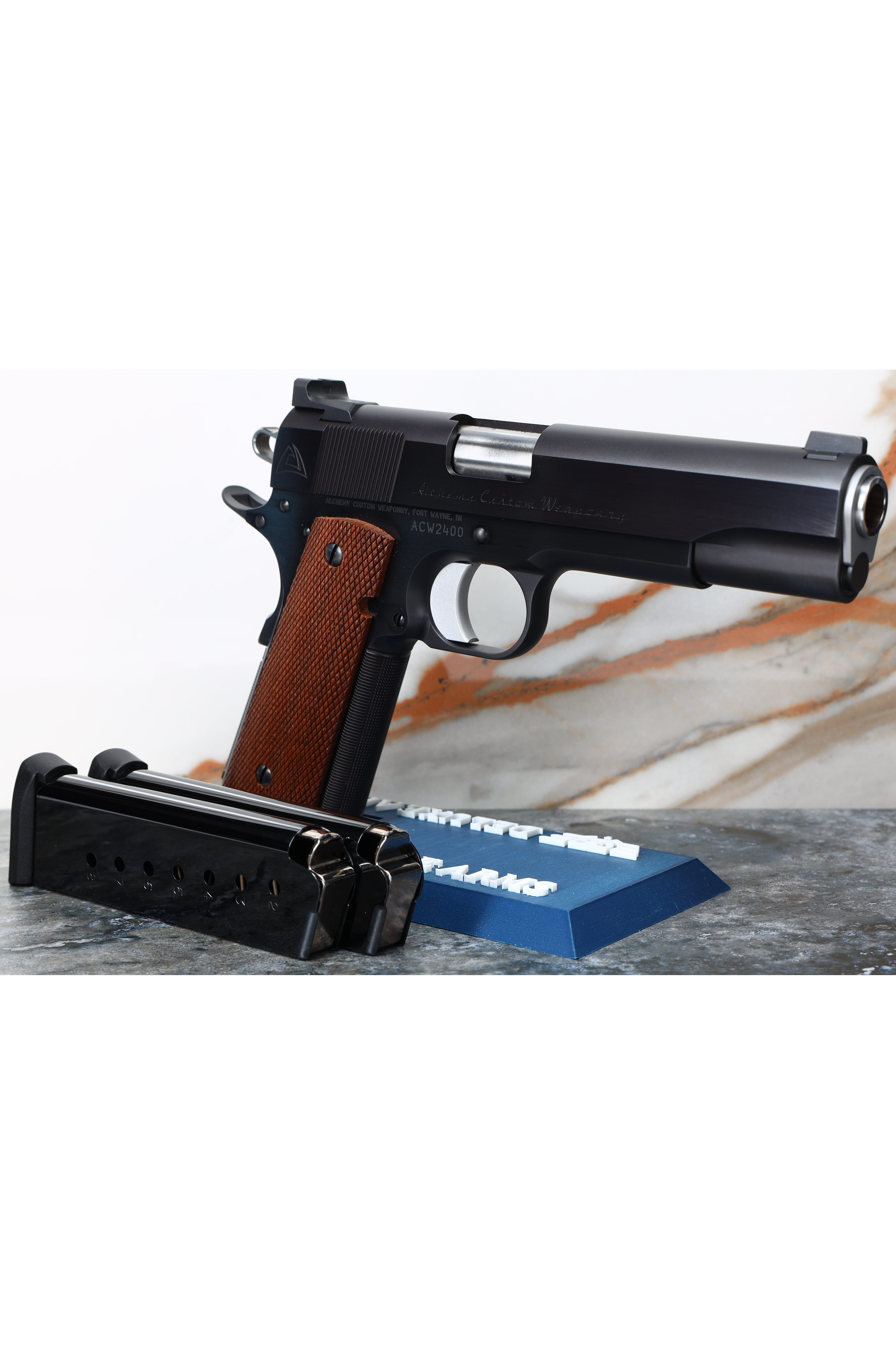 The Alchemy Custom Weaponry Prime 1911 pistol embodies the essence of John Browning's timeless design, reimagined with modern precision for those who appreciate uncompromised craftsmanship. This government-sized masterpiece, chambered in .45 ACP with a 5-inch barrel, features a hand polished blued finish that accentuate its elegant lines. Checkered walnut grips provide a secure hold, while the hand-fitted forged steel frame and billet slide ensure a tight, reliable fit that elevates its performance. The Prime is a testament to Alchemy's dedication to blending tradition with excellence, making it a coveted addition to any discerning collection.